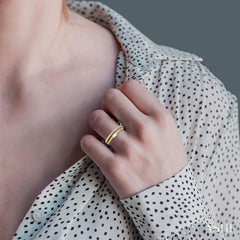 A sleek, modern design diamond fashion ring, this offers a smart look, making it a good addition to one's jewelry collection. It features a split open top, with hollow center and twin rings. Both these rings are studded with diamonds. While one is almost plain, except for the two channel set baguette diamonds forming the centerpiece, the other is fully embellished with round cut diamonds. There are 23 pave set round cut diamonds adorning the second ring. Milgrain highlights the baguette diamond centerpiece. The fashion ring is styled in 14 karat yellow gold. Total diamond weight is 1/5 Ctw.