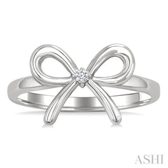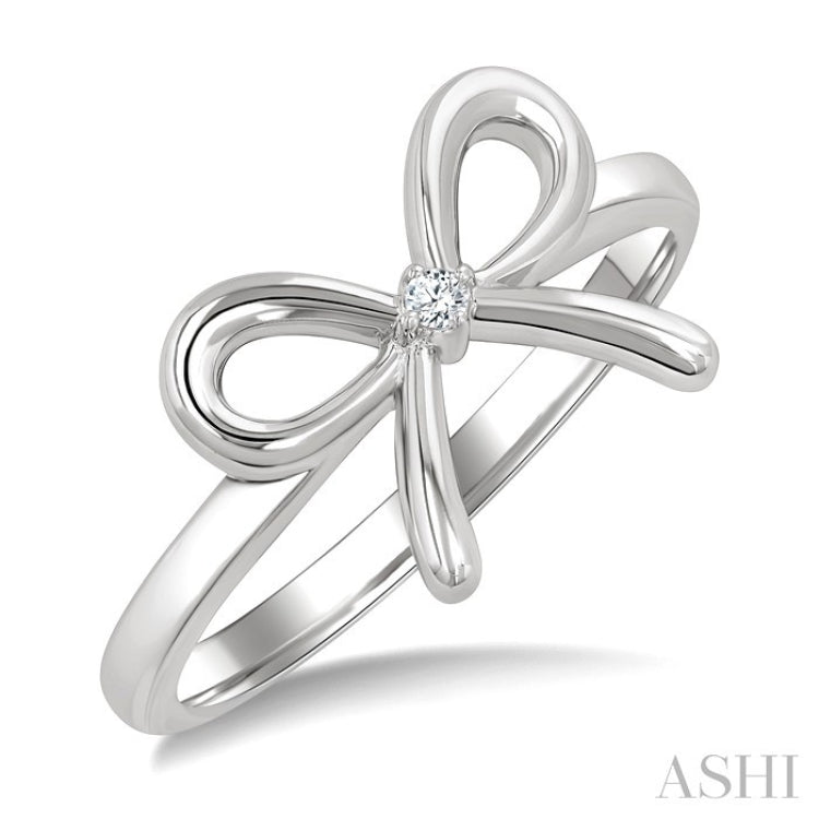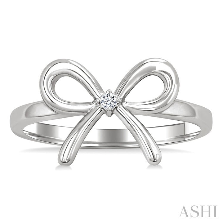 This diamond fashion ring is perfect for those seeking a unique accessory that balances elegance with a touch of whimsy. It features an artful bow tie motif that captures a playful yet refined aesthetic. The centerpiece of the design is a prong set round cut diamond positioned at the knot of the bow, adding a subtle sparkle. This understated diamond accent serves as a delightful focal point, making it an ideal choice for everyday wear. Carved in rhodium finish silver, the bow tie fashion ring exudes modern sophistication with a cool, contemporary sheen. Total diamond weight is 1/50 Ctw.