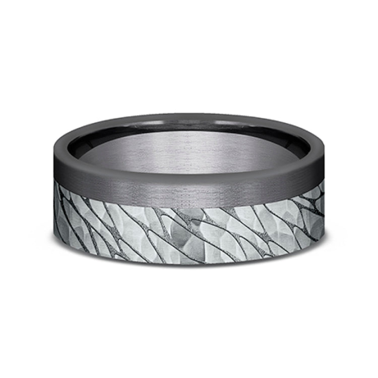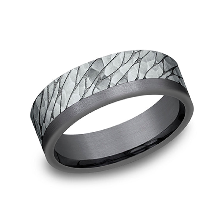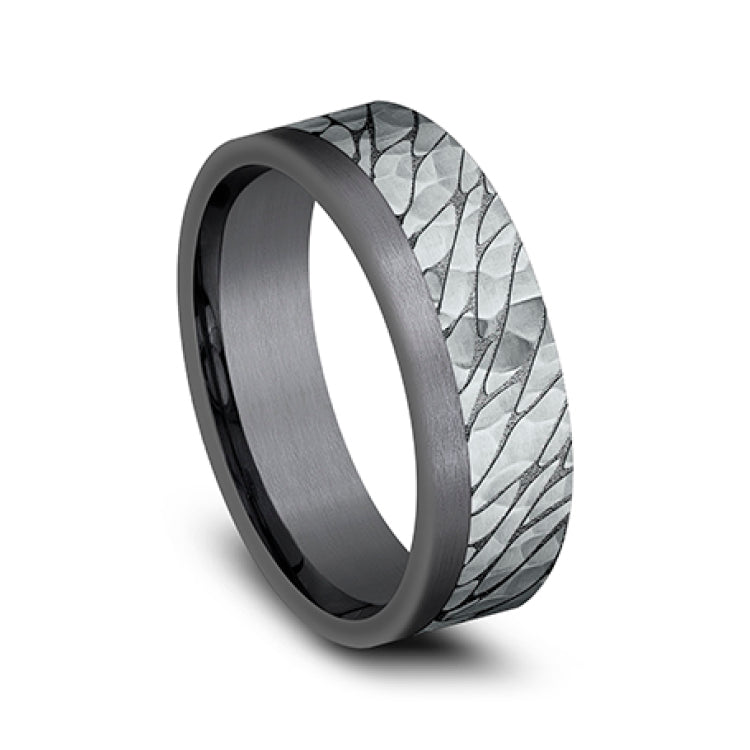 7mm, Comfort fitDarkened Tantlaum and 14K White GoldPebble pattern with hammered finish, one satin edge
