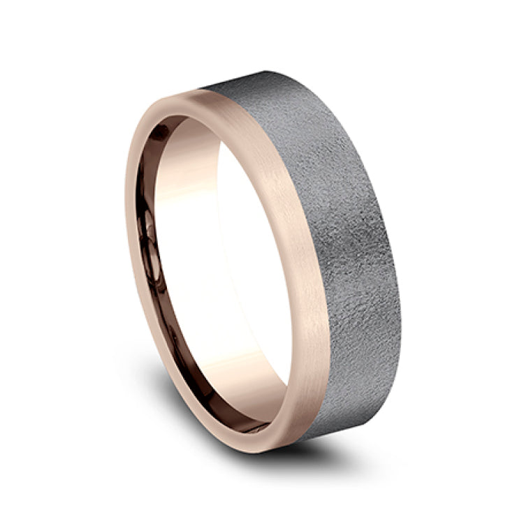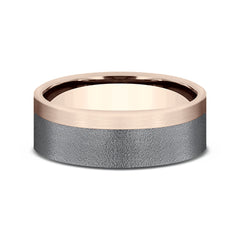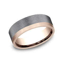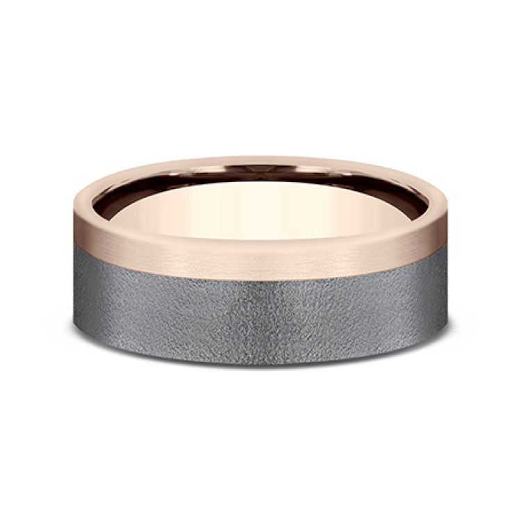 7mm, Comfort fit14K Rose Gold and Darkened TantlaumWire brush finish, one satin edge